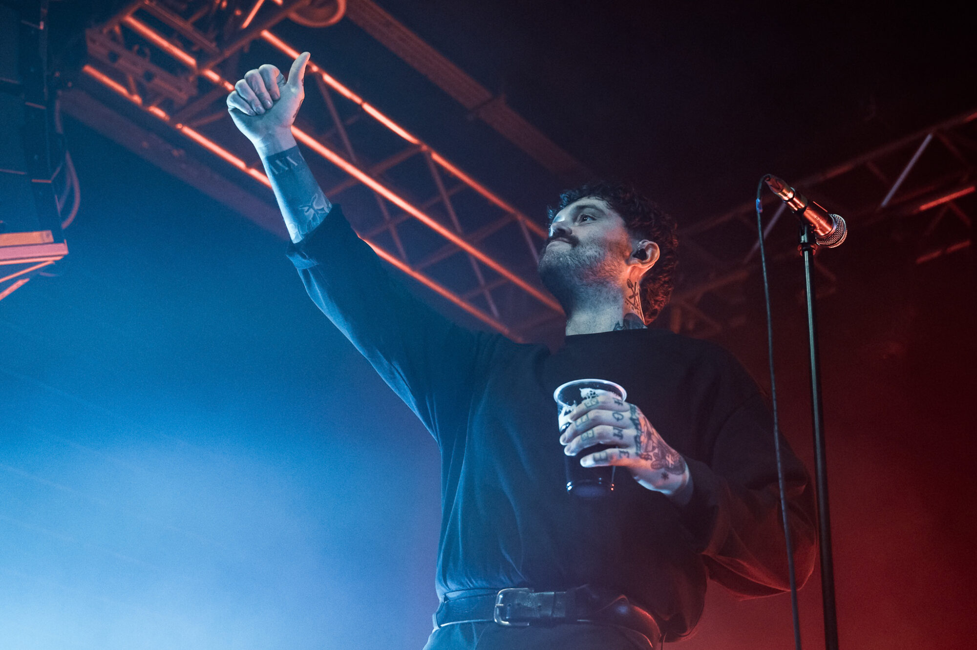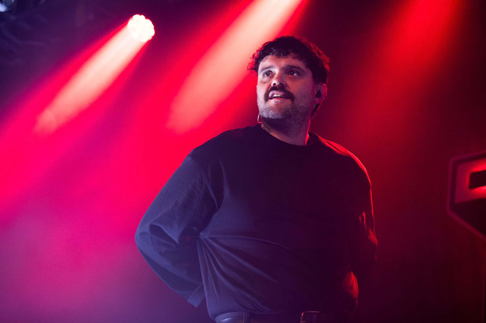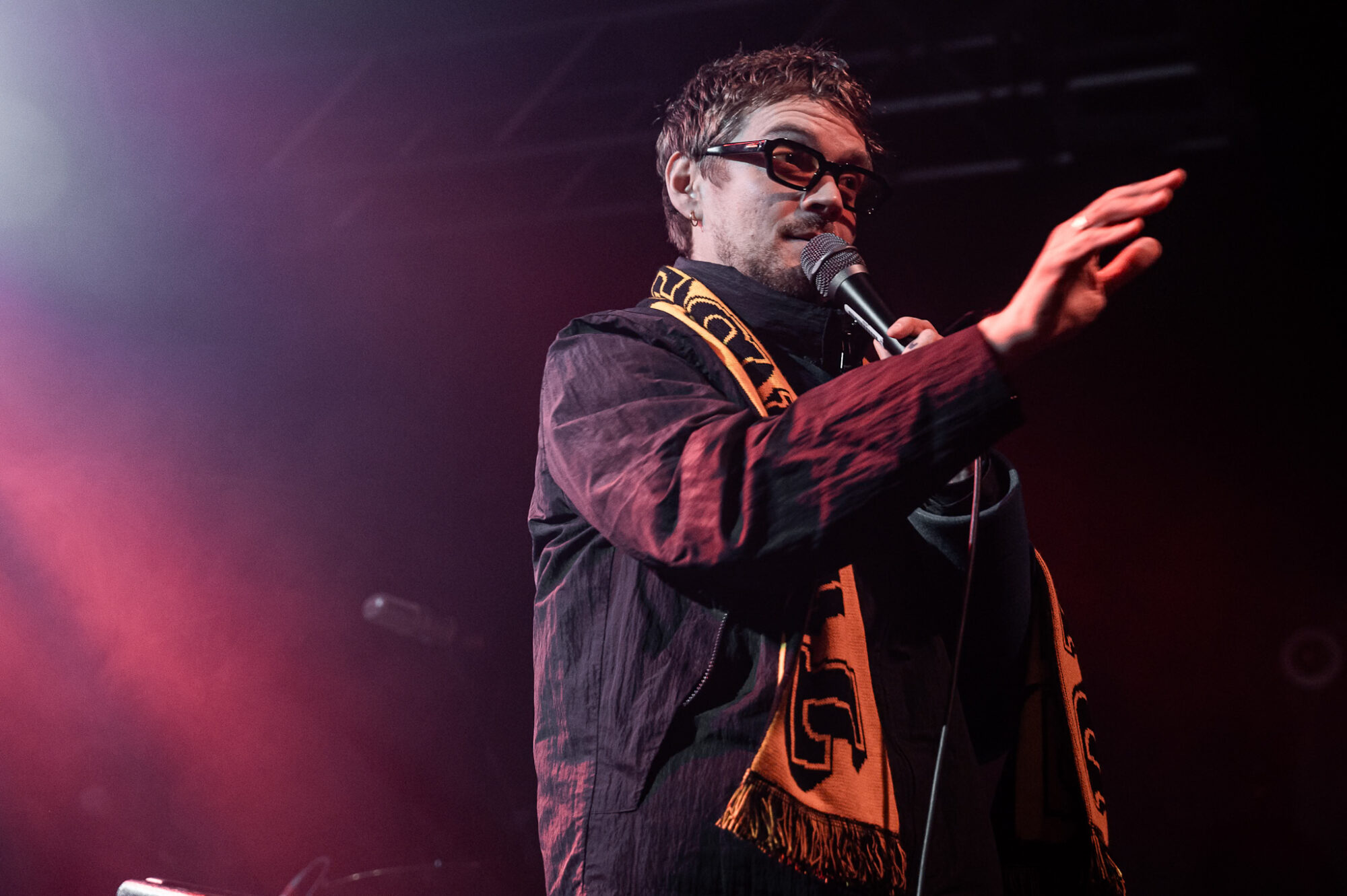 Despite touring ‘Post Industrial Hometown Blues’ to within an inch of it’s life after it’s release, and the more recent release of ‘National Average’ it’s album no1 that dominates the night. And whilst this is no bad thing – ‘Black Dog/White Horse’ the perfect example of how to blend beautiful, tender sounds with the pain of fear, intrusive thoughts, depression not just in yourself but recognising them in others aswell – it’s surprising ‘National Average’ doesn’t feature more. When it does the crowd lap it up. ‘Shop Music’ is massive both in it’s beats and it’s chant of “We will sell your shit”. The shoutalong is huge, the floor bounces, arms aloft and it spreads to the usually relative calm of those on the balcony. ‘Professionals’ and in particular the noise and beats of ‘Yesboss’ see mayhem on the dancefloor. When Hicklin asks if the crowd can sing they do, with gusto. When they’re told to go mental they don’t disappoint. Between songs there’s humour, storytelling, a piss-take of their manager Steve. There’s also poignant moments. Having recently lost a close friend to cancer there’s a raffle to raise money to help support those left behind. Steve makes the draw for the signed drumskin. 140 isn’t around so the prize goes to 143.