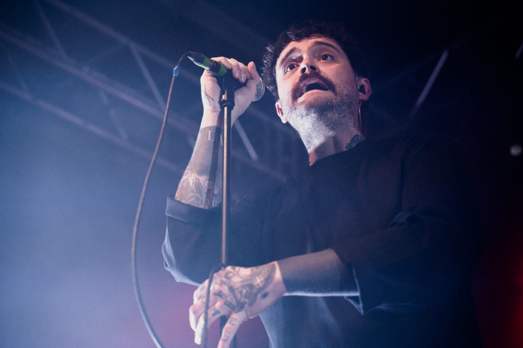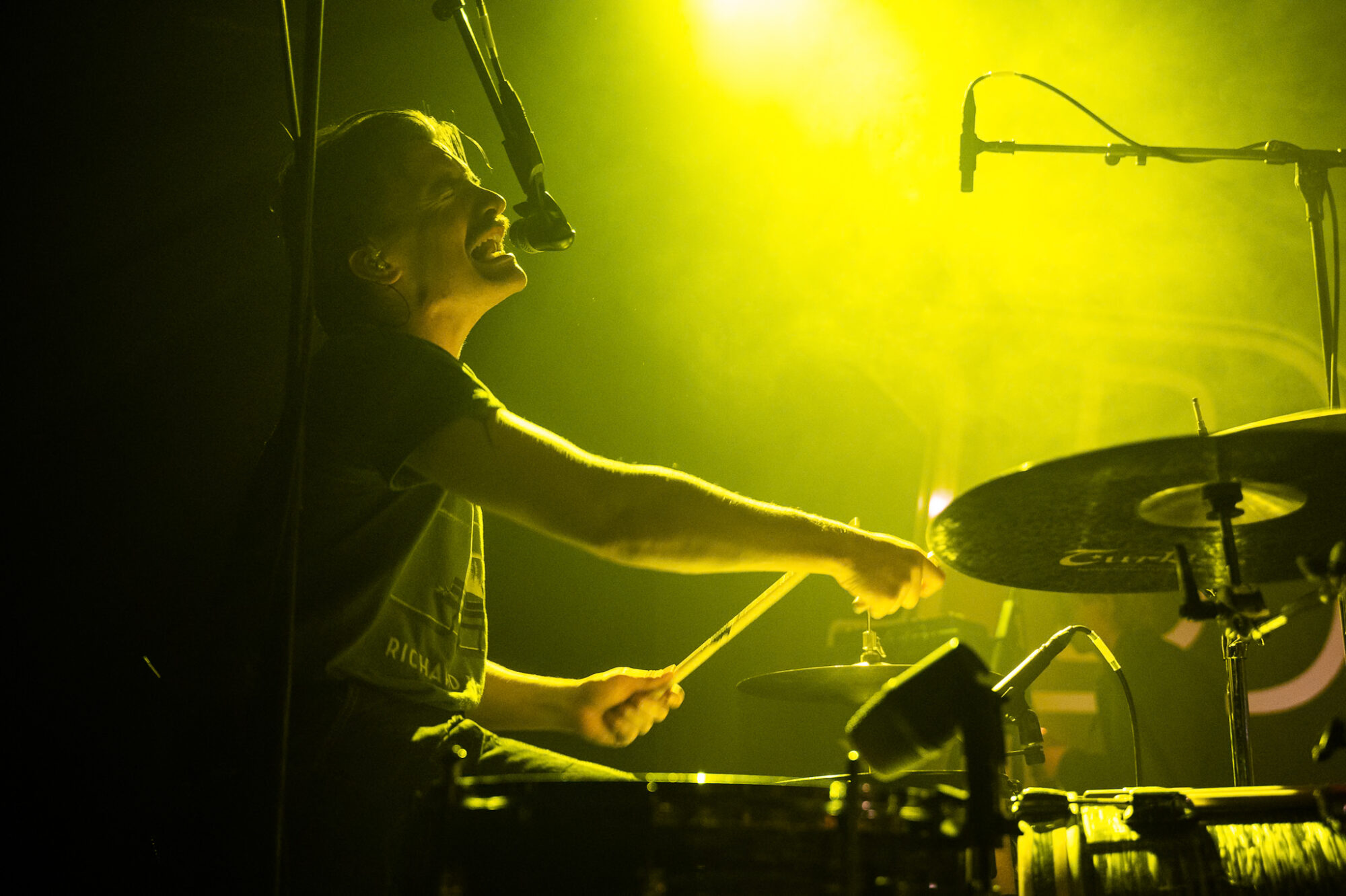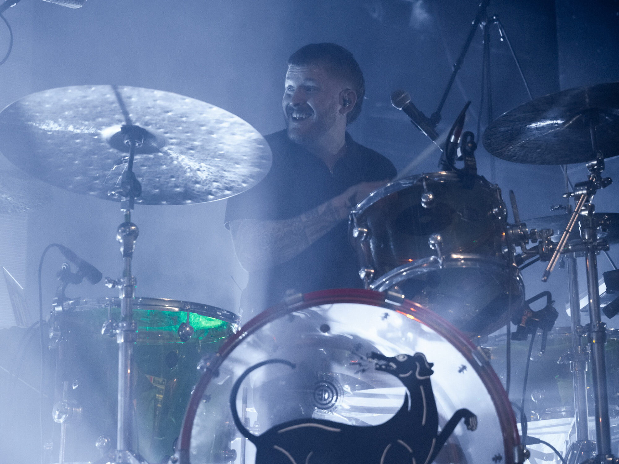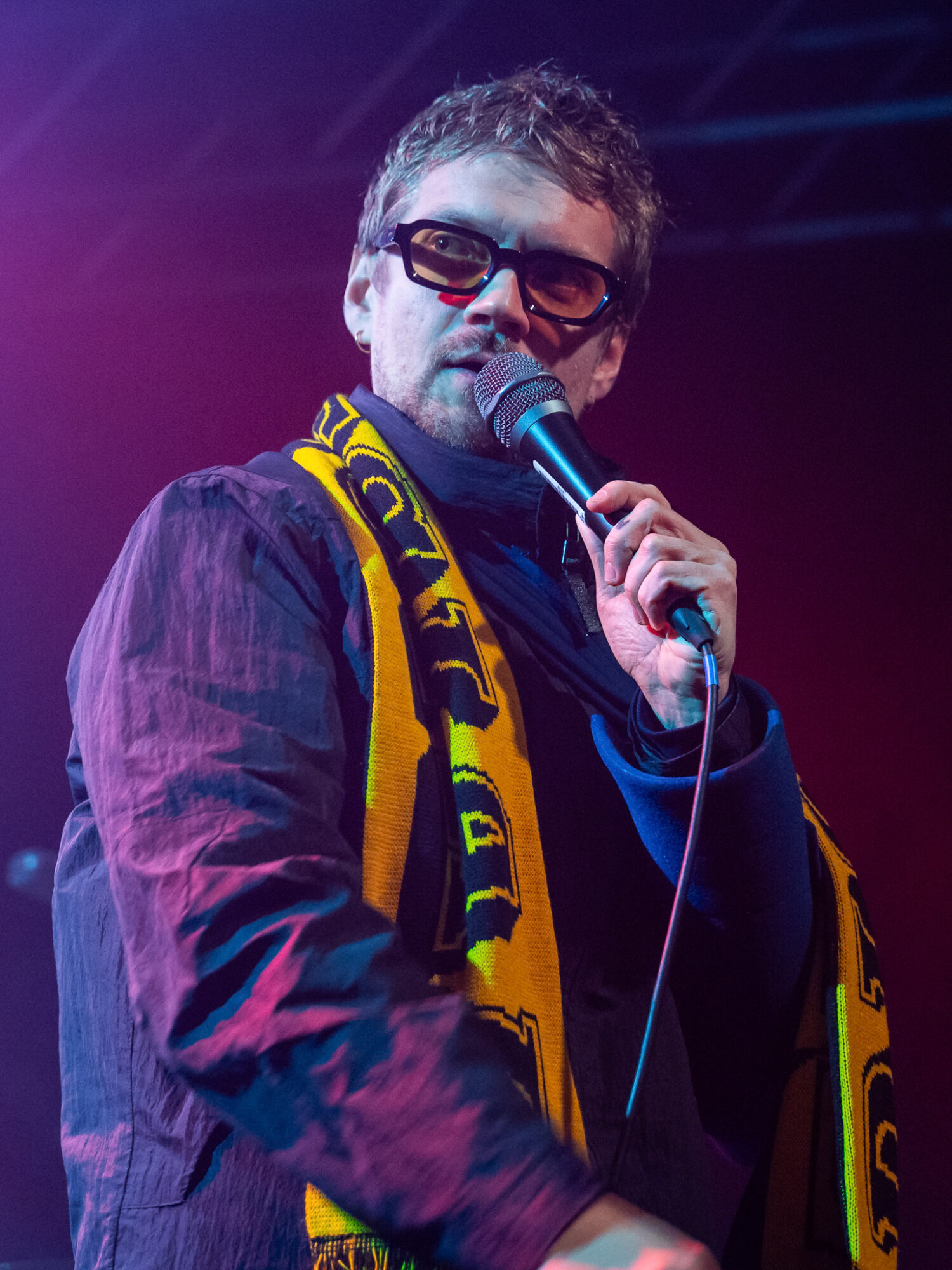 Despite touring ‘Post Industrial Hometown Blues’ to within an inch of it’s life after it’s release, and the more recent release of ‘National Average’ it’s album no1 that dominates the night. And whilst this is no bad thing – ‘Black Dog/White Horse’ the perfect example of how to blend beautiful, tender sounds with the pain of fear, intrusive thoughts, depression not just in yourself but recognising them in others aswell – it’s surprising ‘National Average’ doesn’t feature more. When it does the crowd lap it up. ‘Shop Music’ is massive both in it’s beats and it’s chant of “We will sell your shit”. The shoutalong is huge, the floor bounces, arms aloft and it spreads to the usually relative calm of those on the balcony. ‘Professionals’ and in particular the noise and beats of ‘Yesboss’ see mayhem on the dancefloor. When Hicklin asks if the crowd can sing they do, with gusto. When they’re told to go mental they don’t disappoint. Between songs there’s humour, storytelling, a piss-take of their manager Steve. There’s also poignant moments. Having recently lost a close friend to cancer there’s a raffle to raise money to help support those left behind. Steve makes the draw for the signed drumskin. 140 isn’t around so the prize goes to 143.